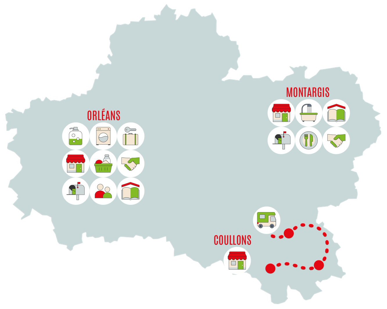 Le territoire du Loiret est divisé en 3 antennes locales à Montargis, Orléans et Coullons.